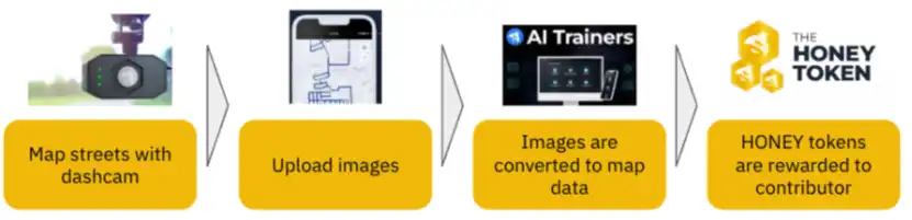 Hivemapper 正在构建一个全球去中心化的地图网络,该网络以无需许可的方式收集最新的高分辨率数据。Hivemapper 依靠贡献者社区使用车辆行车记录仪收集 4K 街道级图像。这些范围从拼车司机到送货司机和业余爱好者。此外,一群被称为「AI 培训师」的人使用 Hivemapper 的 Map AI 引擎参与图像分析,并将其转化为客户所需的有价值信息。