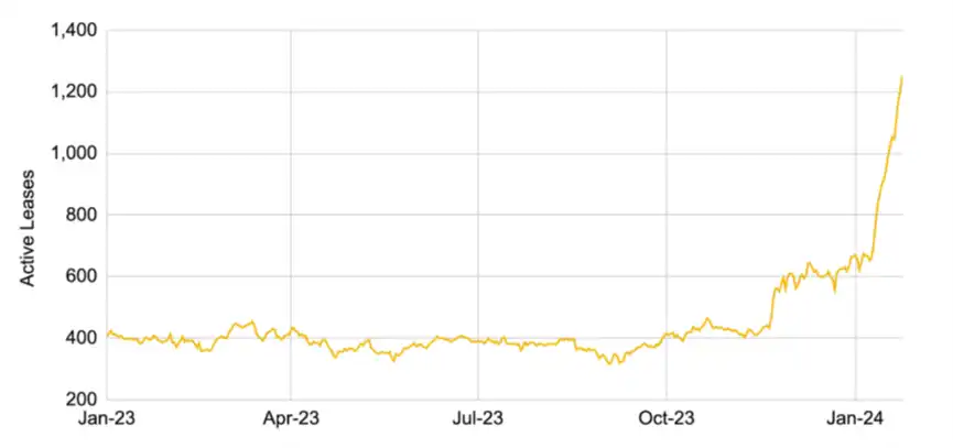 正如我们最近关于人工智能和加密货币交叉点的报告中所研究的那样,除了由竞争性定价推动的增长外,像 Akash 这样的去中心化计算网络也乘上了人工智能增长的浪潮,并在其平台上看到了活动的增加。高性能 GPU 在众多机器学习和 AI 应用中至关重要,大型语言模型的广泛采用导致对它们的需求激增。在过去的一年里,Akash 网络上的活跃租约有所增加,与 2023 年初相比增加了两倍多。租约表示计算资源的租用。