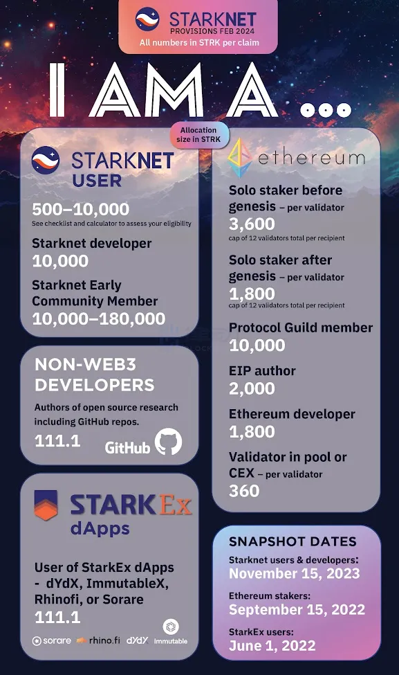 SNF 将代币分发计划称为「Provisions」而非「Airdrop」,本次代币分发的主要对象为 Starknet 支持者、以太坊生态支持者,以及非 Web3 开发者。
