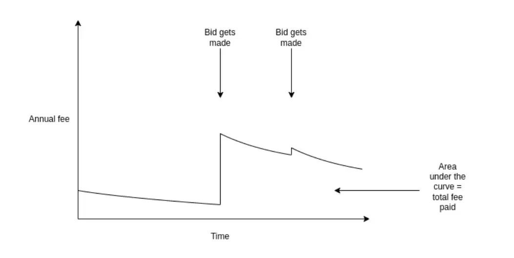 这种机制允许任何人对域名进行竞标,如果竞标持续一段时间,年费就会根据这个浮动估值的一定比例来确定。这样,域名所有者要么接受高价出售,要么支付更高的费用,以此来减少抢注现象。