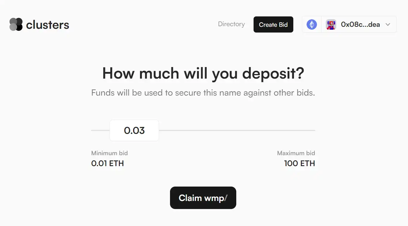 在你开始使用 Clusters 之前,你需要准备一些 ETH 用于竞标你选择的名称。一旦你的资金准备好了,你可以按照以下步骤操作: