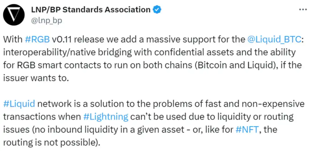 RGB 协议本身就有与其他 UTXO 架构公链结合的可能性,LNP/BP 协会的官推表明会支持与 Liquid 的互操作性。