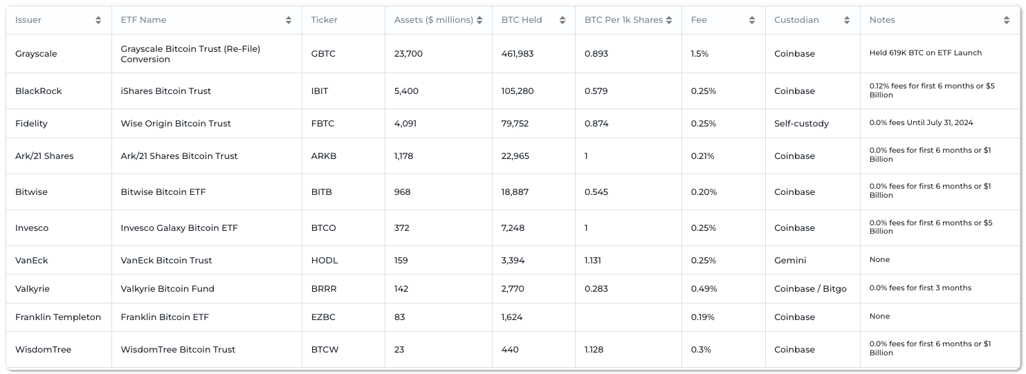 其余的ETF,包括Invesco、VanEck、Valkyrie和Franklin Templeton,由于管理资产规模(AUM)尚未突破5亿美元,因此还差得很远。