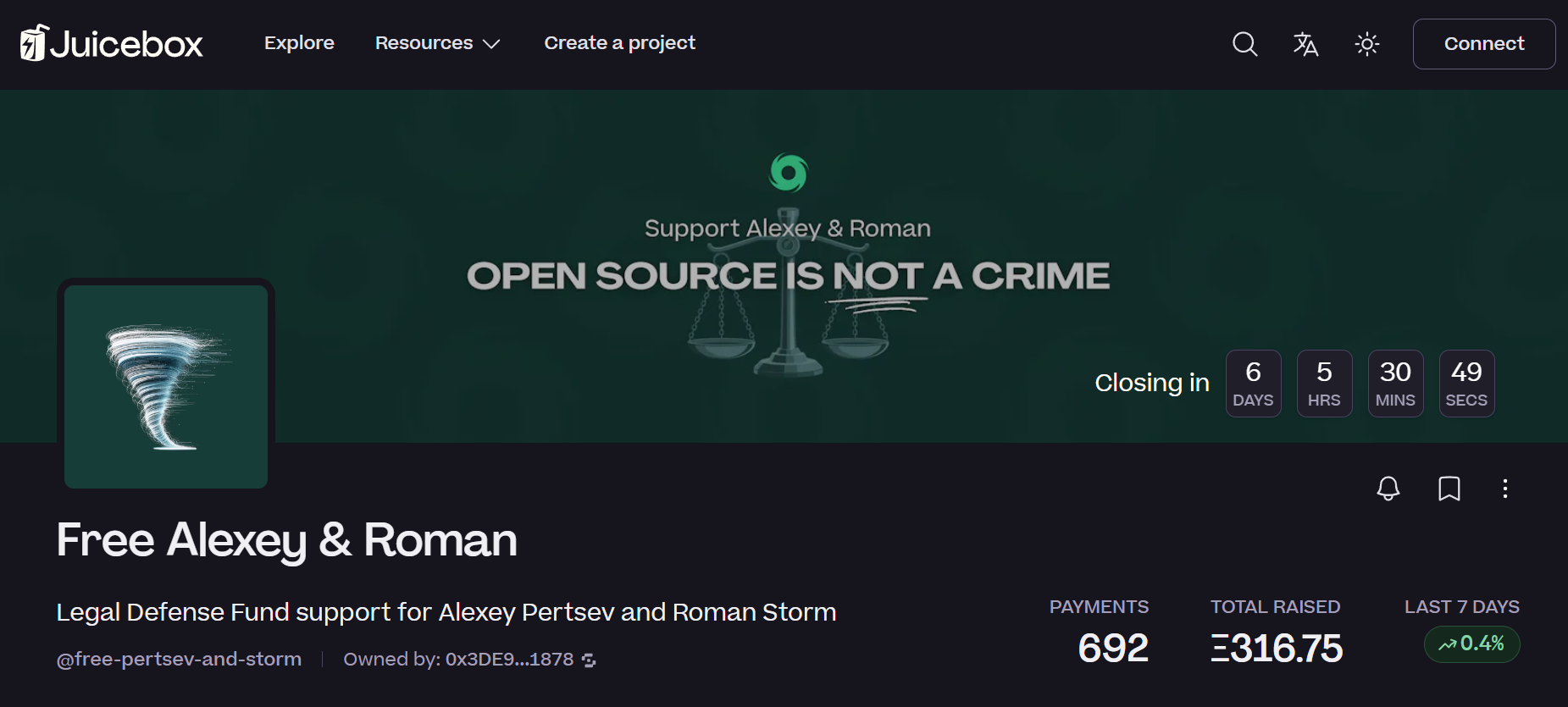 龙卷风现金 "的 GoFundMe 在上线时已募集到 3 万美元捐款。Storm和Pertsev的目标是筹集150万美元,用于支付在美国的法律费用。二人目前依靠加密货币筹资平台 JuiceBox 募集了 316.75 以太币(ETH))。