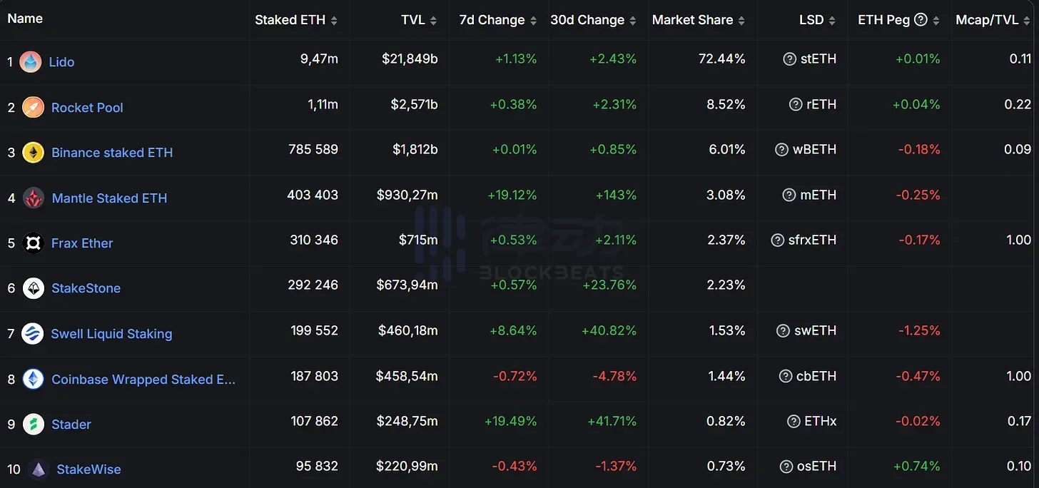 在下面 DeFiLlama 的截图中,你可以看到 liquid staking 流动性质押协议(Lido、RocketPool、Mantle、Frax、 Swell 等)。