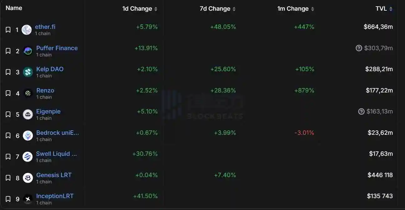 在第二个屏幕截图(如下)中,您可以看到最大的 liquid restaking 协议(ether.fi)、Puffer、Kelp、Renzo 等等。