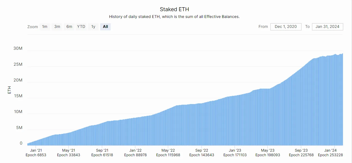 大约四分之一的流通中的 ETH 被质押了(总共 1.2 亿 ETH,约约 3000 万被质押)。