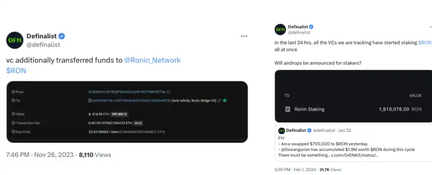 而据社区观察,在 Impossible Finance 发布公告前一周,就有巨鲸向 Ronin 网络转入大量资金,0x088 开头的地址将 474.99 枚 ETH(价值约 99 万美元)转移至 Ronin 网络上,彼时 RON 的价格不足 1 美元。在 Ronin 上线 Binance 前,社区也发现多个 VC 创始人开始大量买入 RON,Tagent 创始人 Wangarian 已持有超 190 万美元的 RON。