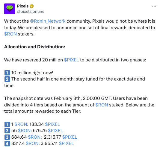 在 Binance 挖矿即将结束时,Pixels 于 2 月 18 日在社交媒体上宣布将向 RON 质押者空投,并表示已预留 2000 万 PIXEL 代币用于分两个阶段分发,快照日期为 2 月 8 日 10:00。用户可获得的 PIXEL 代币根据质押的 RON 数量被分为 4 个等级,其中质押 1 RON 即可获得 183.34 PIXEL。