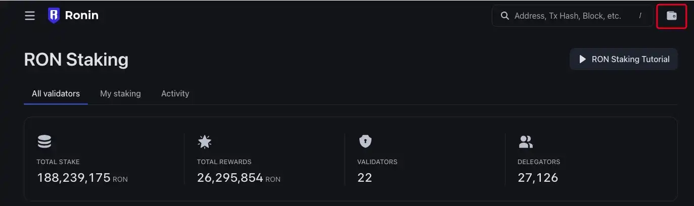 从 Ronin 官网进入质押界面,点击右上角钱包图标,连接自己的钱包。