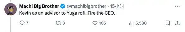 知名 NFT 收藏家、曾经的 BAYC 最大持仓者黄立成(Machi)在回复 Adam 时亦同意「Yuga 需要换帅」,并呼吁「将 BAYC 系列从 Yuga Labs 旗下独立出来」。