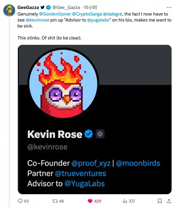 另一位比较知名的 BAYC 社区成员 GeeGazza(曾拉过知名说唱歌手 Eminem 入场)亦失望地表示:「说实话,我现在看到 Kevin 在其简介上写的 『Yuga Labs 顾问』 几个字就想吐。」