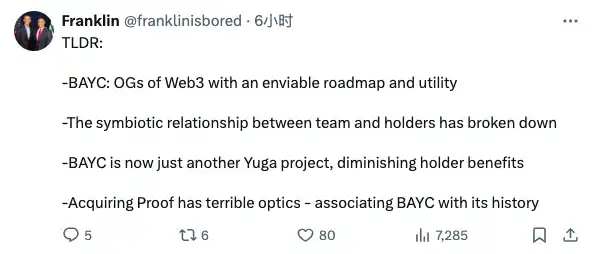 另一位知名 NFT 收藏家 Franklin 则表示,对于 BAYC 的持有者来说,突然与该项目与一位在业界非常不受欢迎的创始人联系在一起,简直就像是被打了一记耳光……Yuga Labs 收购 PROOF 听起来就像 LVMH 收购安然一样离谱。