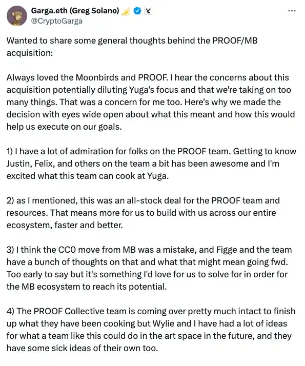 针对社区的普遍质疑,Yuga Labs 联合创始人之一 Garga.eth 今日于 X 平台发文表示,已听到了有人在担心这笔收购可能会分散 Yuga 的注意力,这也是 Yuga 所关心的问题,团队之所以作出了这一收购决定,是因为相信 并清楚 PROOF 团队能够为 Yuga 做出贡献,双方可以在整个生态系统中一起构建更多、更快、更好的内容。