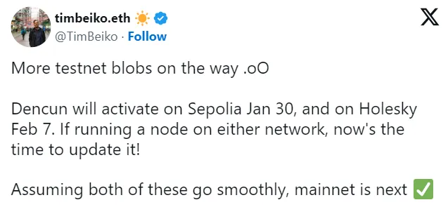 Dencun 升级的部署过程包括在各个测试网络上的激活,今年 1 月底在 Goerli 和 Sepolia 测试网的激活之后,2 月 7 号也成功完成了在 Holesky 测试网进行测试的最后阶段。