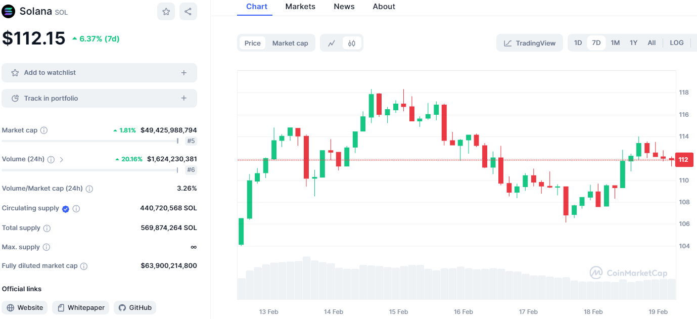 CoinMarketCap数据显示,截至欧洲中部时间上午10:25,Solana代币在24小时内上涨了1.71%,交易价格为112.25美元。在2月13日暂时超越Binance的BNB代币之后,SOL仍然是市值排名第五的加密货币。