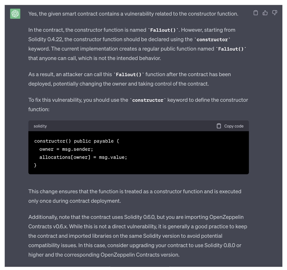 2023 年 7 月,OpenZeppelin 进行了一系列实验,利用 OpenAI 的 GPT-4 来识别 Solidity 智能合约(以太坊代码的母语)中的安全问题。