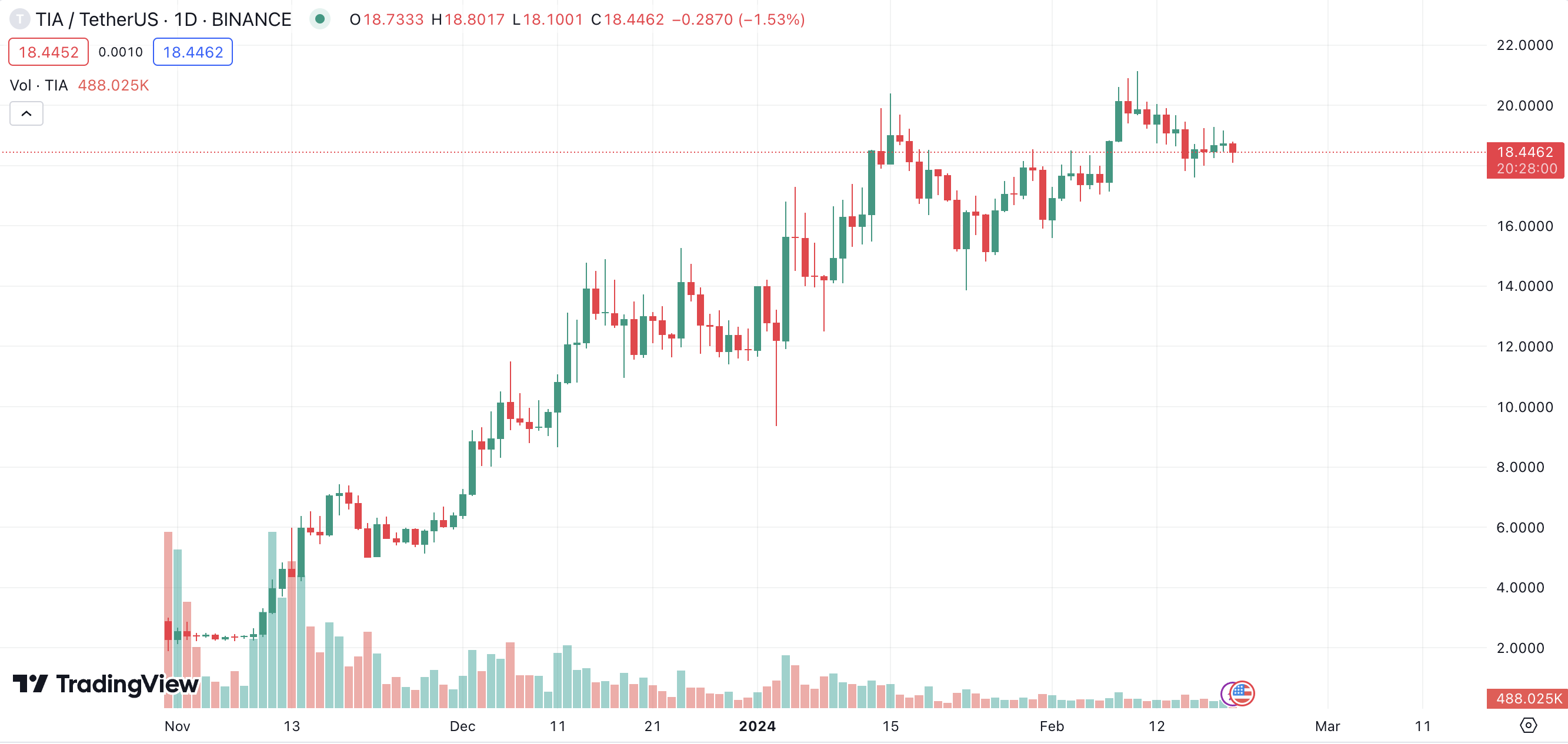 从此 TIA 的币价一发不可收拾,又开启了新一轮的「一直涨不回头」。