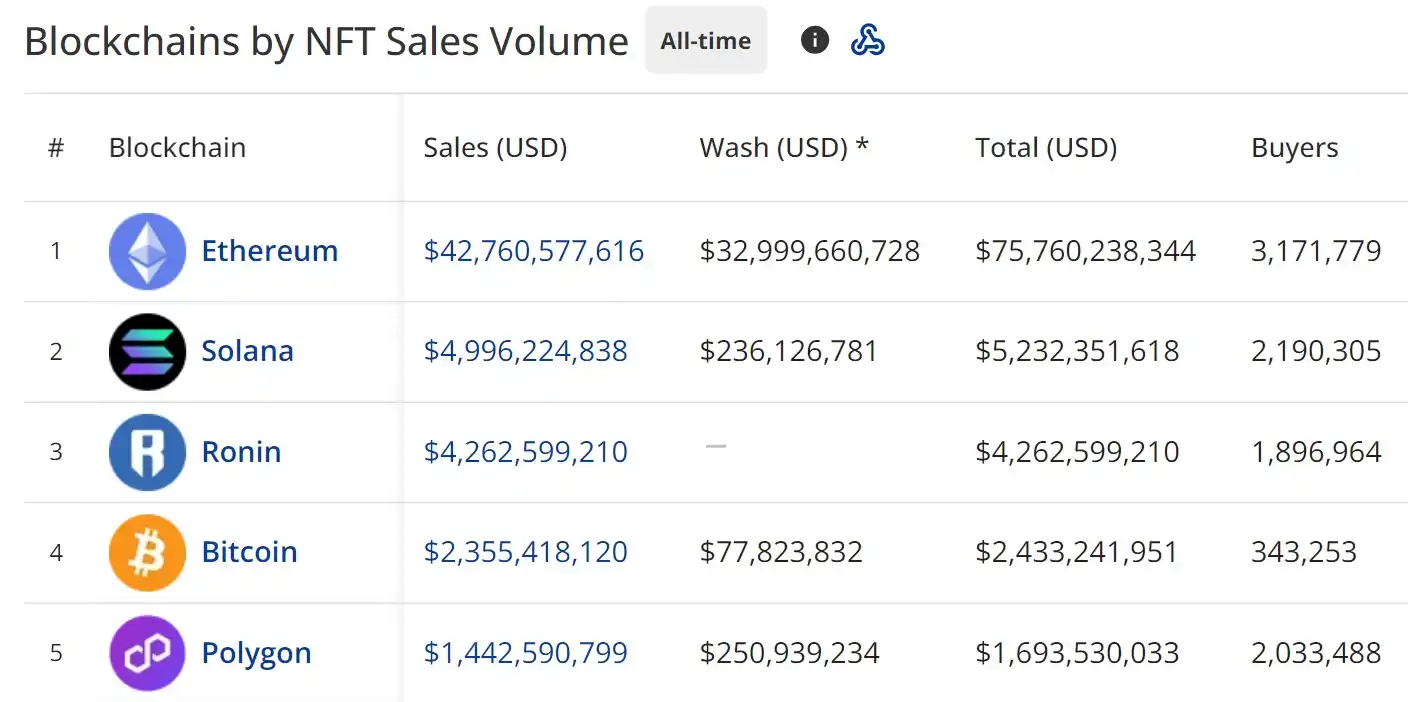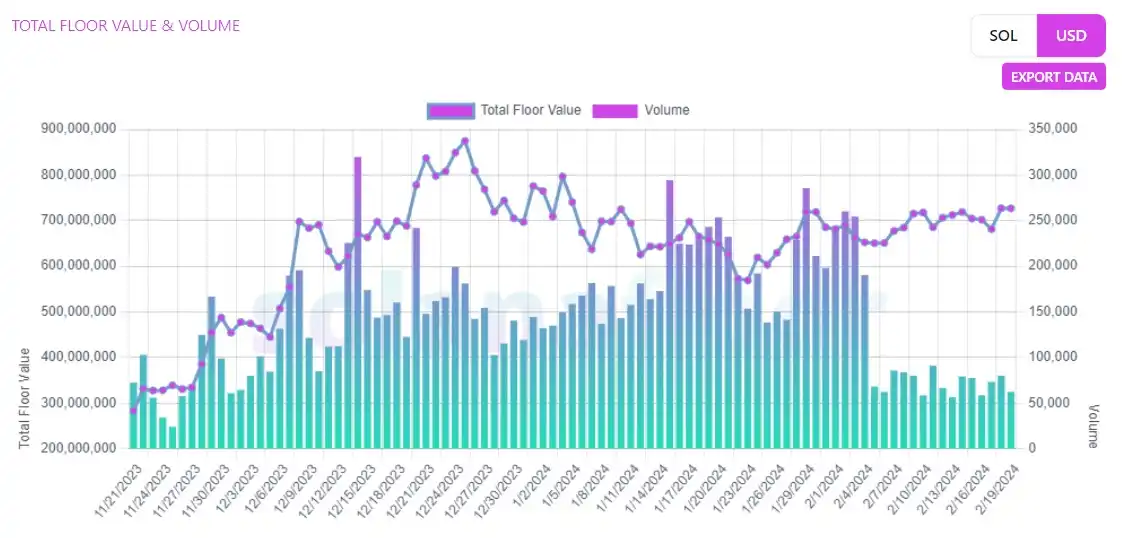 截至 2024 年 2 月,Solana 还促成了 价值约 50 亿美元的 NFT 交易量,使其成为目前仅次于以太坊的第二活跃的 NFT 交易链。