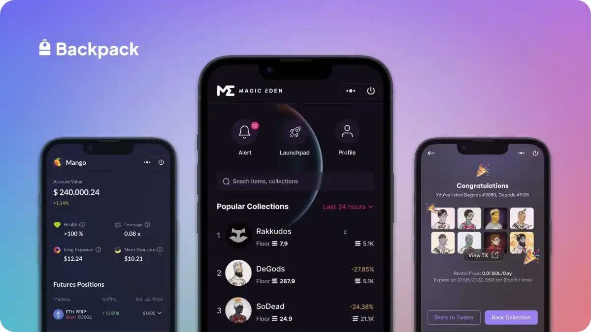 至于钱包的选择,Phantom、 Magic Eden Wallet 或 Backpack 都是不错的选择 。Phantom 和 Magic Eden 均提供多链支持,例如以太坊和 Polygon 钱包,而 Backpack 针对交互式 xNFT 体验进行了优化。