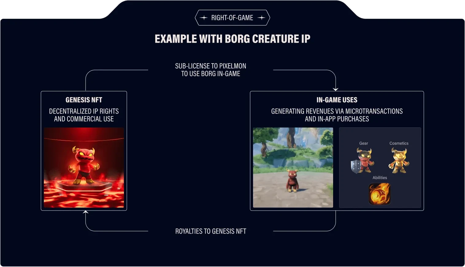 Pixelmon 构建了两套 NFT,将其命名为游戏所有权(Right-of-Game、RoG)系统,它由创世 NFT 和 游戏内 NFT 组成。