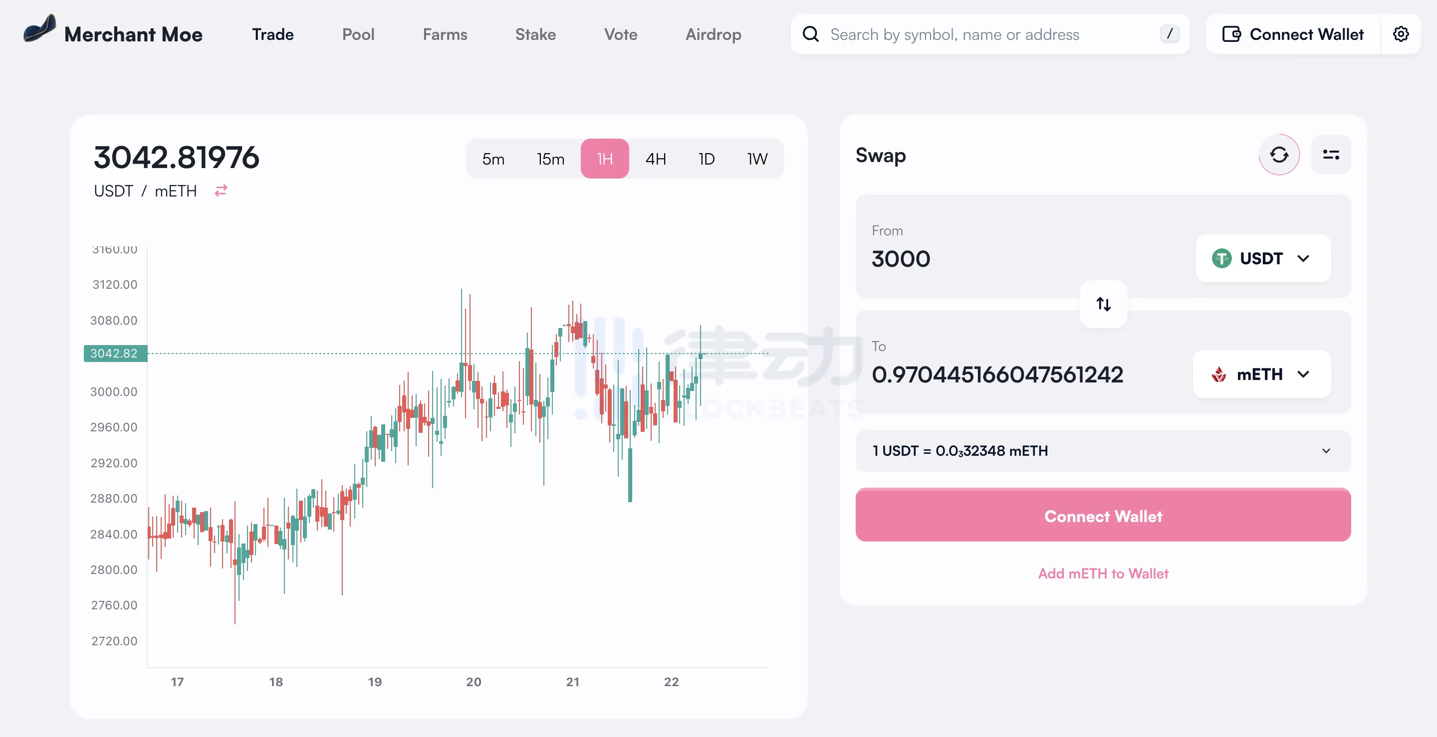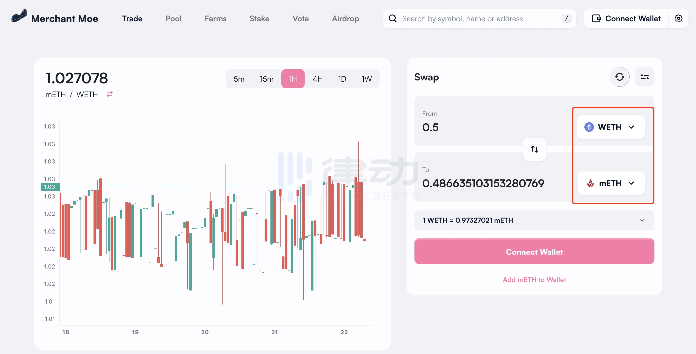 1、使用 Mantle 生态 DEX Merchant Moe 购买 mETH;