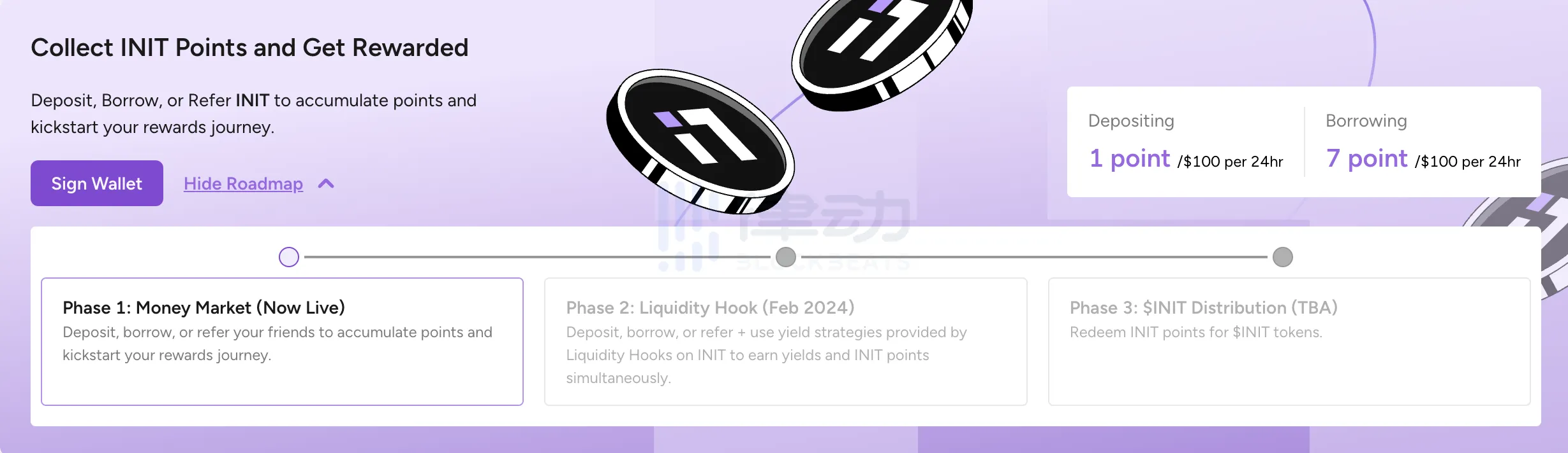 Liquidity Hooks 将于 2 月 28 日上线,此后将有更多 DEX 等 DApp 接入 INIT Capital。INIT Capital 官网给出的路线图称将会将会在第三阶段进行$INIT 的 TBA,而目前项目还停留在存借款赚积分的第一阶段,因此对于用户来说还有很大的早期参与空间。