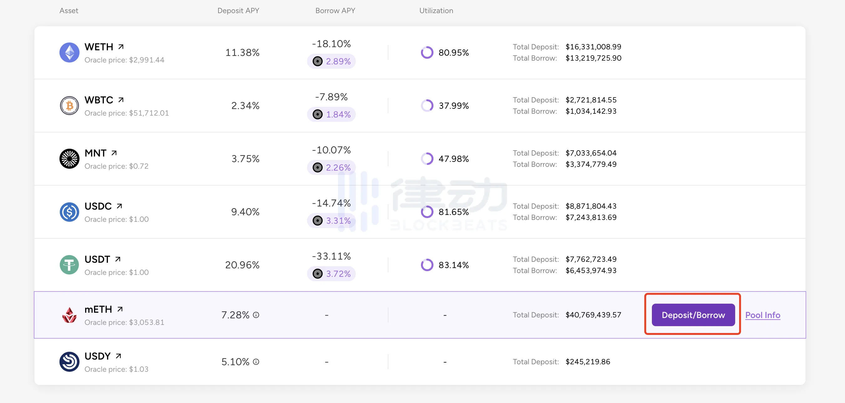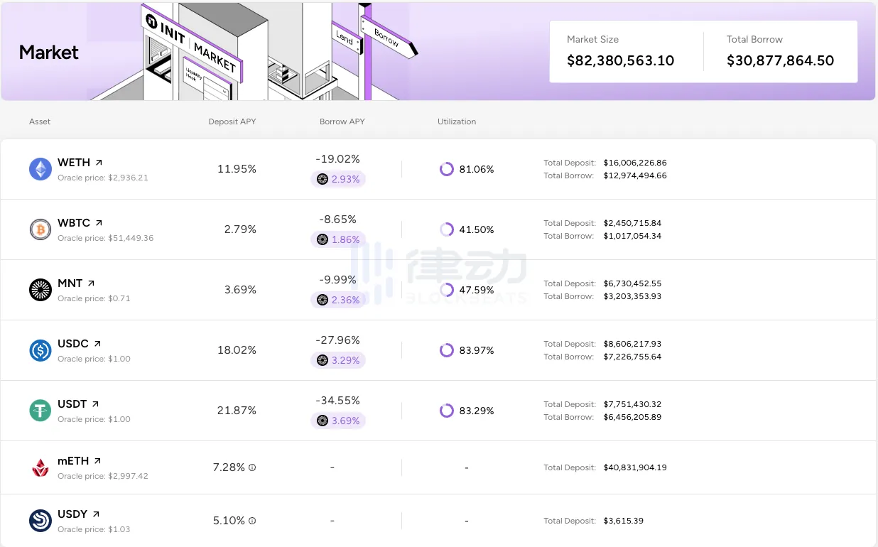 INIT Capital 上目前已有的资产清单包括 WETH/ETH、MNT、WBTC、USDT、USDC、USDY、mETH,在 Liquidity Hooks 功能上线后,还将支持 wstETH 以及一些类 UniswapV2 LP 代币等。