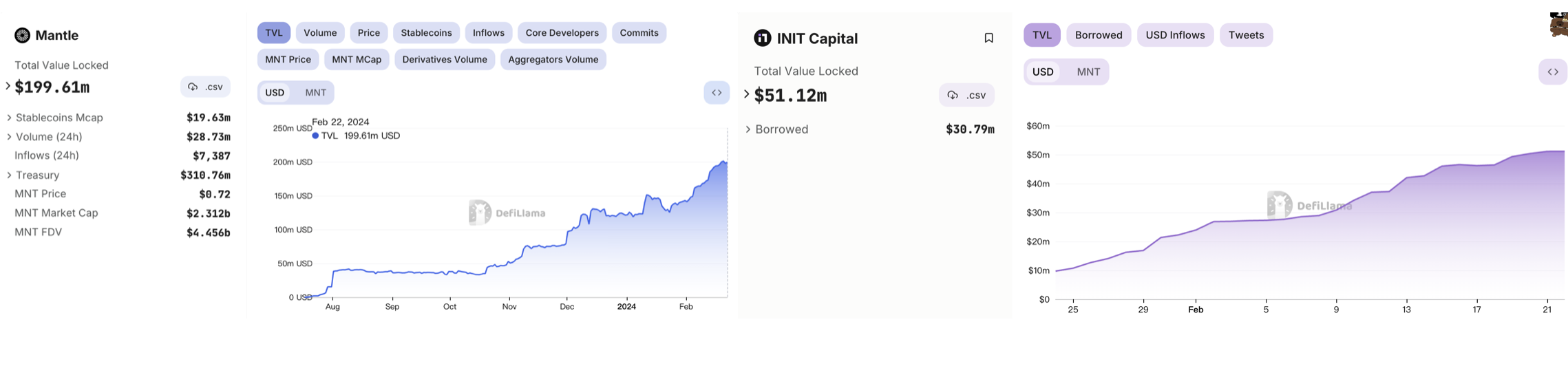 悄然间 Mantle 的 TVL 逼近 2 亿美元,近一月涨幅达 50%,生态里的借贷协议 INIT Capital TVL 月涨幅达 383%,TVL 已超过 5000 万美元,借贷 (Borrow) 活动量达 3079 万美元。