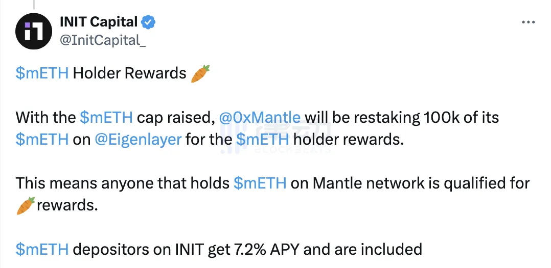 mETH 目前已经成为 EigenLayer 上排名第四的 LST。mETH 持有者可以获得 EigenLayer 空投,这对使用 INIT 的用户来说是一石二鸟的获利策略。