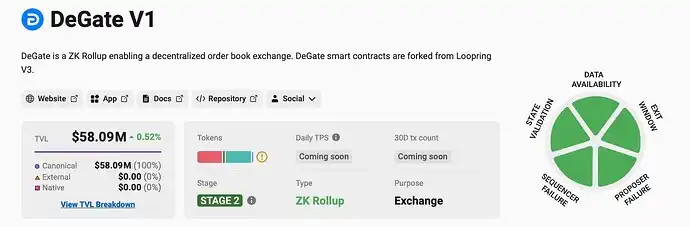 先介绍一下 L2Beat 的「STAGE」评价体系。L2Beat 是根据 5 种风险因素,来评判「免信任」的完成度,L2Beat 称之为「成熟度」。这 5 种风险因素分别是 (1) State Validation(状态有效性的查验), (2) Sequencer Failure(排序器失效),(3) Proposer Failure(上链者失效),(4) Exit Window(用户逃离的窗口期),(5) Data Availability(数据可用性)。以下图为例,只有针对 5 项风险因素全部评价为绿色,才能得到 STAGE 2 评级,目前所有 ZK Rollup 项目中得到 STAGE 2 评级的只有一个,就是图中展示的 DeGate。