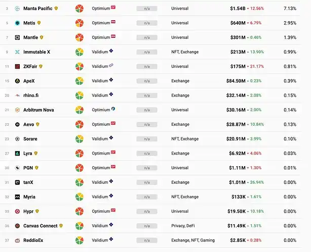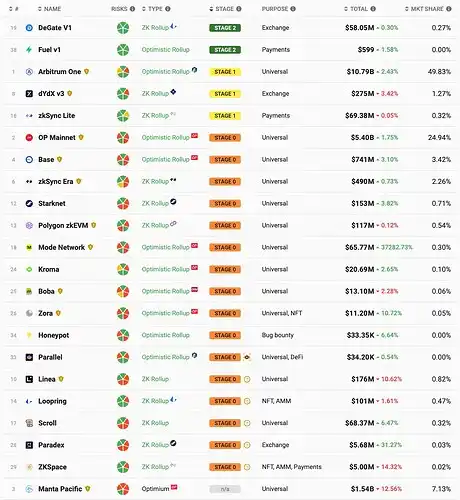 我们借用 L2Beat 上展示的信息,来梳理一下这两大挑战。下面的截图展示了 L2Beat 上当前正在运行的全部 38 个 L2 项目,以「STAGE」的评价标准从高到低排序。