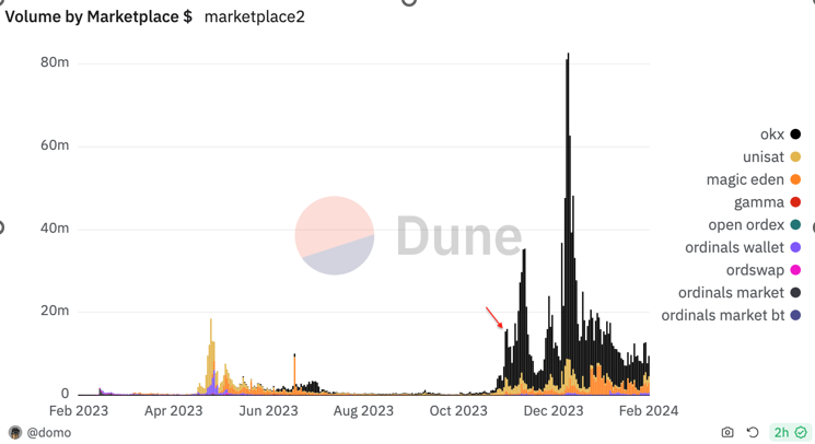11 月 7 日,Binance 宣布上线铭文 ORDI,随后铭文市场交易量暴涨,并迅速突破此前的历史高点。