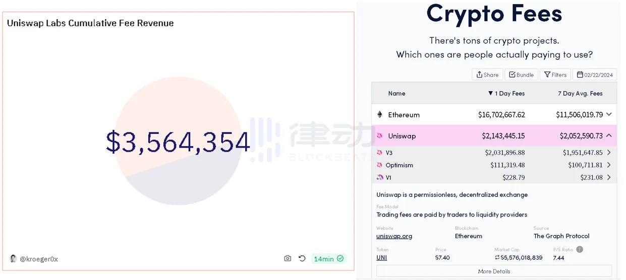 据 CryptoFees 数据显示,Uniswap 过去 24 小时产生 214 万美元手续费。另据 Dune 数据显示,自 2023 年 10 月 17 日实施收费新政以来,Uniswap 前端交易费用收入目前已达 3,564,354 美元。此次协议升级之后,可以预见通过 Uniswap 投资的高回报率将会吸引大量用户持有 UNI。
