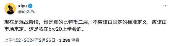 比特币生态早期 KOL xiyu 也表示:「现在是混战阶段,谁是真的比特币二层,不应该由固定的标准定义,应该由市场来定。这是我在 brc20 上学会的。」