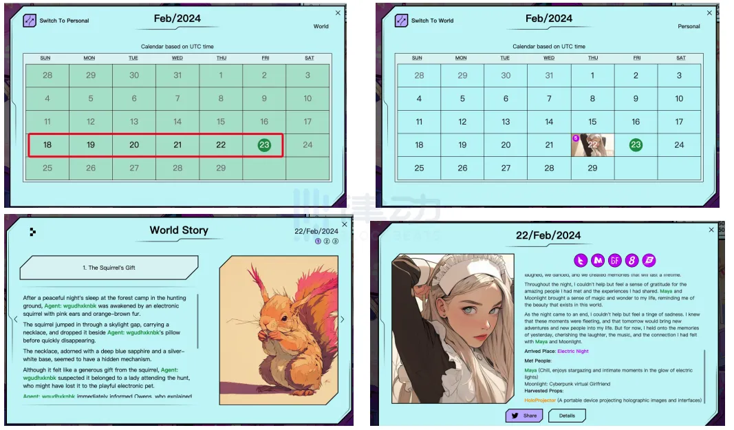 进入游戏后,首先会阅读 Ulti-Pilot 的《World Story(世界故事)》,从这里了解 Ultiverse 的历史世界观。自上线以来,《World Story》每天更新。在总体事件线发展的同时,用户的每一次自主探索历程也会生成一本日记,日记包含重要事件、遇到的角色和获得的物品。用户将能够通过 Ulti-Pilot 整合文本、图像、视频、AI NPC、AI 生成的地图等各个要素创建自己的虚拟世界。