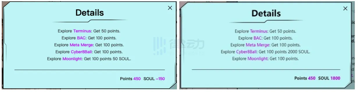 需要注意的是,每次探索可获得的 SOUL 是随机的,有可能花费了 SOUL 进行探索后颗粒无收。所以在这种情况下,就有两种参与方式。选择每天做完 MISSON 获得 SOUL,然后只参与不需要 SOUL 的探索任务获得积分,这样不会损失 SOUL。或者将全部 SOUL 用于探索任务,提高积分,使之后获得 SOUL 的概率变高。从玩家反馈上看,获得 SOUL 的情况相差很大,其概率与积分数量、是否拥有 Electric Sheep 等有关。