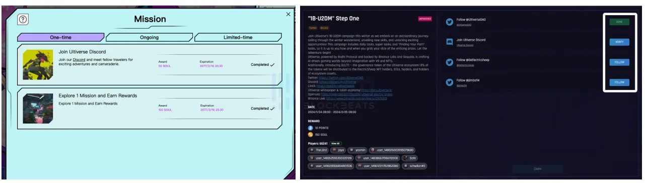 左:Ulti-Pilot 的 Misson 页面;右:Ultiverse 任务平台