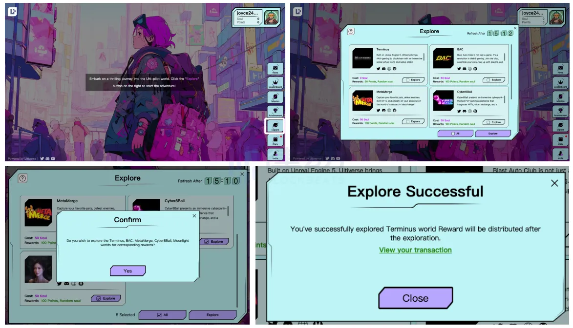 探索时,玩家可以选择单个世界或同时探索多个世界。除了免费探索 Teminus 的主世界外,玩家需要支付一定数量的 SOUL 才能在各个游戏世界中进行链上互动,探索任务每 24 小时重置一次。探索完成后,Pilot 积分和 SOUL 奖励将自动发放至玩家账户,玩家可使用获得的 SOUL 奖励再次进行探索。玩家获取 SOUL 的渠道,除了在 Ulti-Pilot 游戏中每天会更新的「Misson」完成任务外,还包括Ultiverse 任务平台做任务、质押 Electric Sheep 等方式。