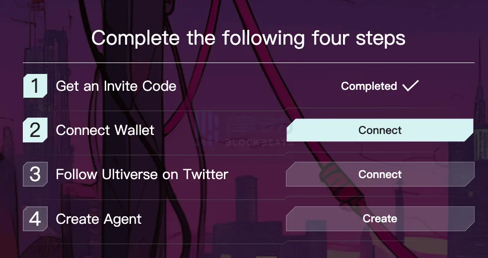 进入官网 https://pilot.ultiverse.io/,输入邀请码后绑定推特+钱包,需要注意的是,如果在这之前做过 Ultiverse 的其他任务,绑定账户与之前注册账号时推特、钱包和 Discord 的绑定情况相一致,否则无法绑定。