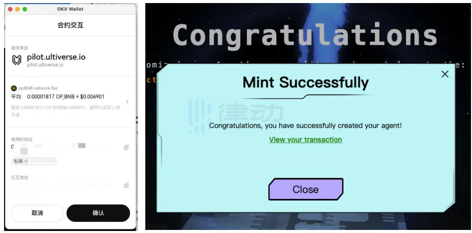 完成测试后,点击 CONFIRM 即可 mint 玩家角色,这个过程中需要花费 OPBNB 作为 gas 费,成本不到 0.1 美元。