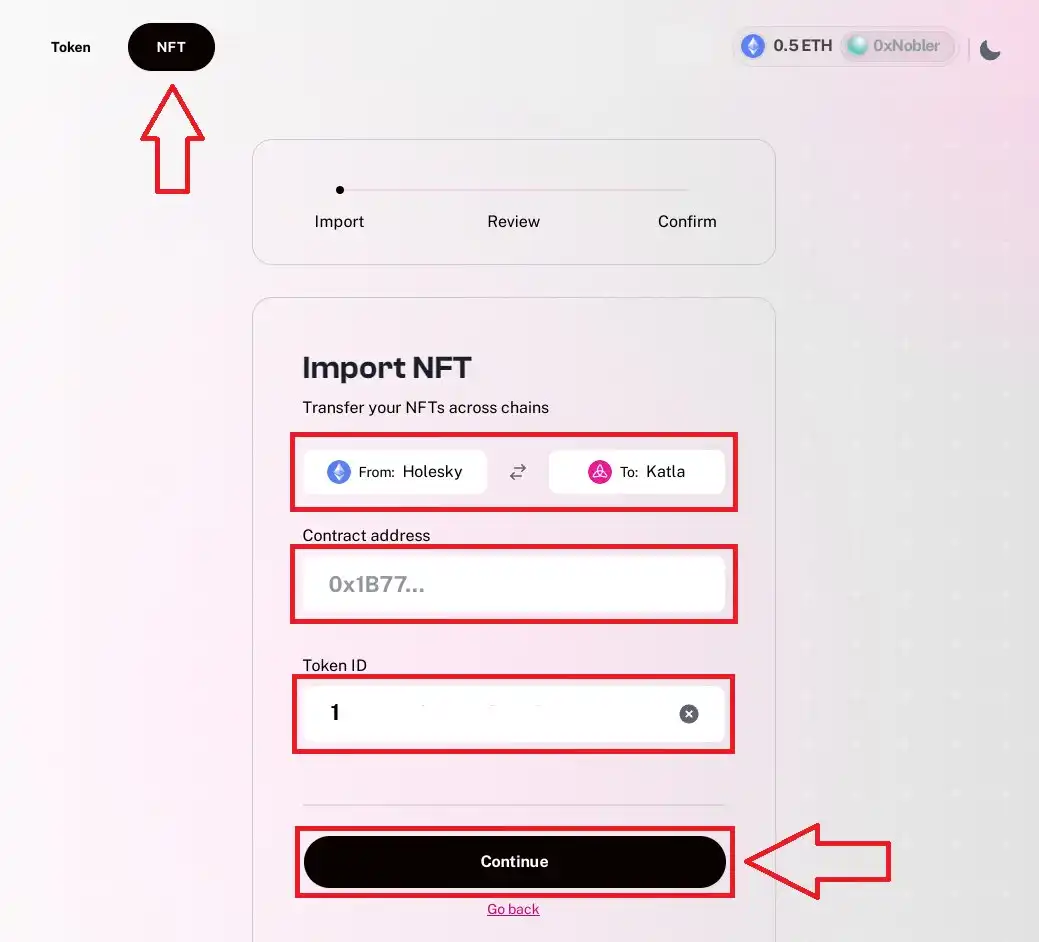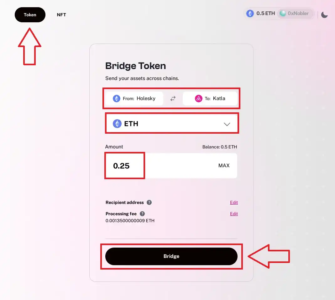 · 选择 Holesky → Katla,选择「ETH」,输入金额,按「Bridge」并确认交易