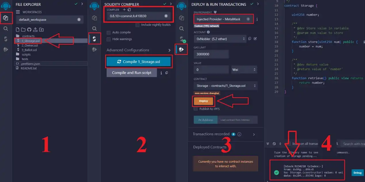 · 点击第三个图标(Solidity 编译器),选择 0.8.10 版本,然后点击「Compile 1_Storage.sol」