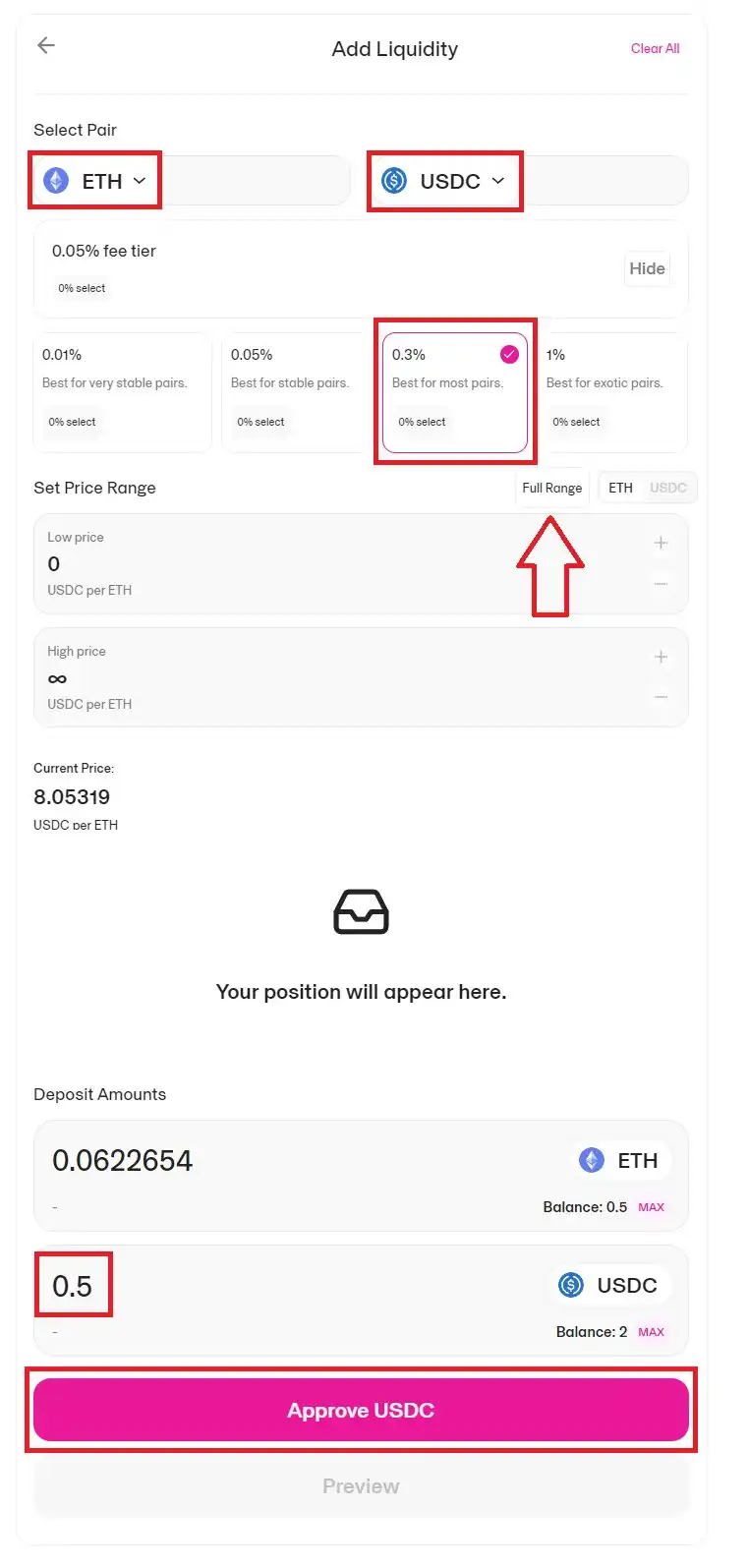 · 选择代币对,设置费用,点击「Full Range」,输入金额,点击「批准」,确认交易