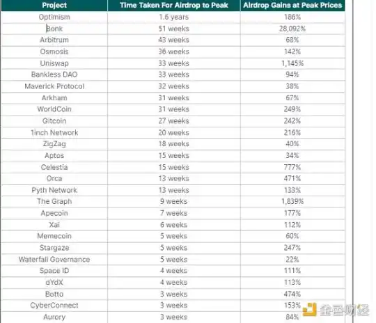 截至 2024 年 2 月 20 日,50 个最大空投达到历史最高代币价格所需的天数、周数或年数,以及相应的峰值价格回报百分比: