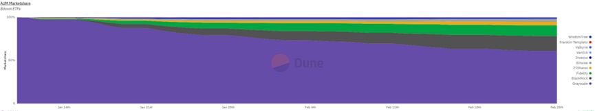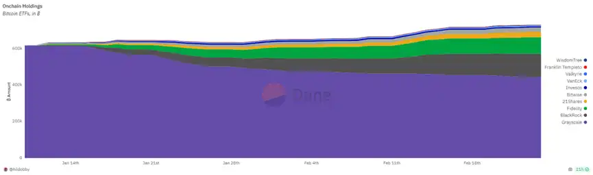 与之相对的是,贝莱德(BlackRock)推出的 IBIT 从 1 月 10 日的 228 个比特币增持到如今的 12.69 万个比特币。贝莱德是全球最大的资产管理公司,其在全球管理的资金规模约为 8.9 万亿美元。无论从客户资源还是品牌效果上,都是众多 ETF 产品中最具竞争力的一支。目前,贝莱德管理和富达投资的比特币 ETF 持仓量已超过 MicroStrategy 公司的 19 万个。另一家 ETF 发行商 Fidelity 也将比特币的增持份额增加至 9.16 万个,这两家机构几乎将灰度减仓的比特币全部吃进。因此,从这个角度来看。比特币 ETF 的持仓增量还没有显现太大的效果,而是处于各个发行商之间互搏的阶段。