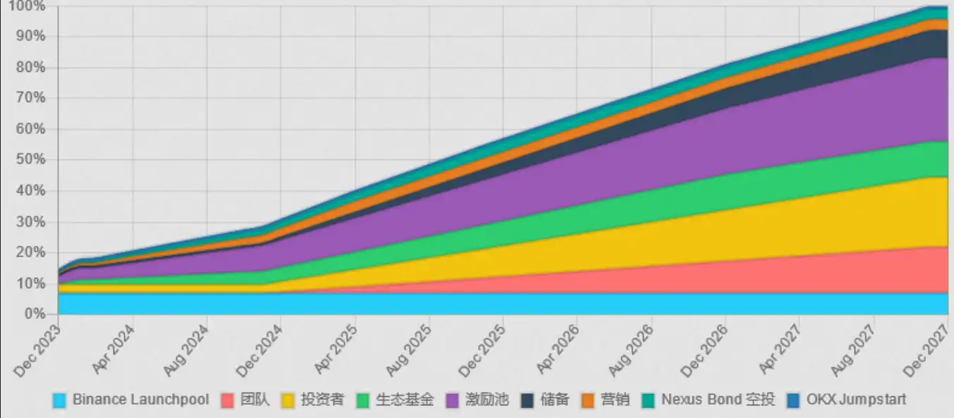 ACE 主要用于 Fusionist、ACE Arenas 以及 Endurance 之上,代币首次发行为 147 万个,占总量的 1%,有一定的解锁期,从下图可以看到初始解锁量相对较少,市场抛压并不大。