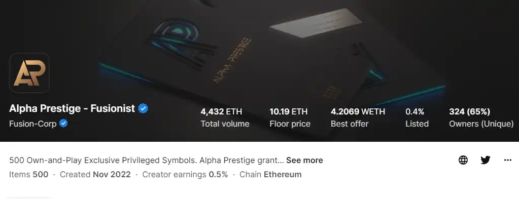 Alpha Prestige 是一种中心化奖励系统,也是一组 NFT,Alpha Prestige NFT 的总供应量固定为 500 个,在 Fusionist 游戏中拥有多种权利,其所有者可以获得大量游戏内的福利,包括参与 Beta 测试、空投、优先活动时段和每日 ACE 代币奖励等,用户可以在 OpenSea 上进行购买。