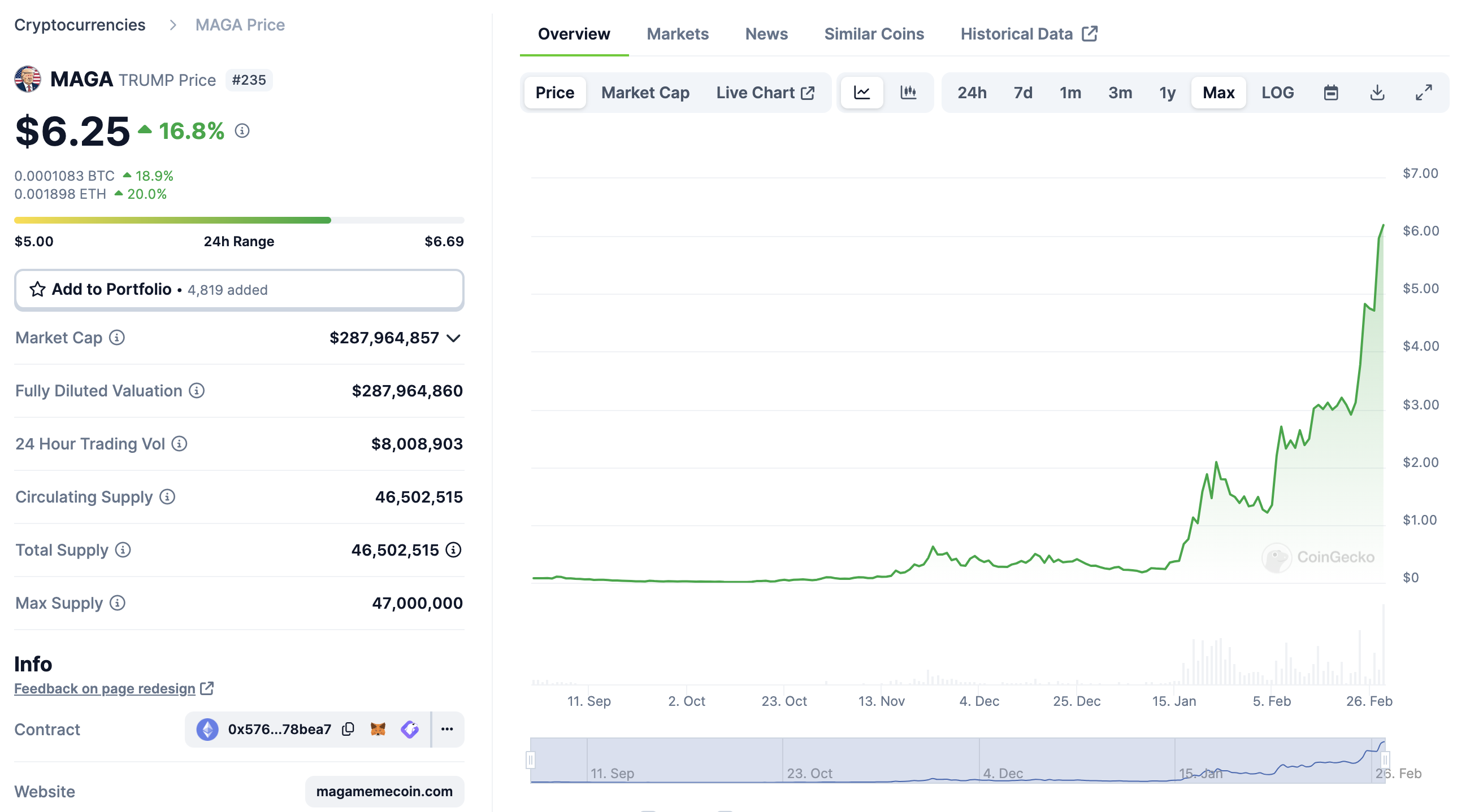 2 月 6 日,TRUMP 的价格为 2.2 美元,按照当前 6.25 美元的最新价格计算,当日建仓 TRUMP 目前已经获得 184% 的投资收益。