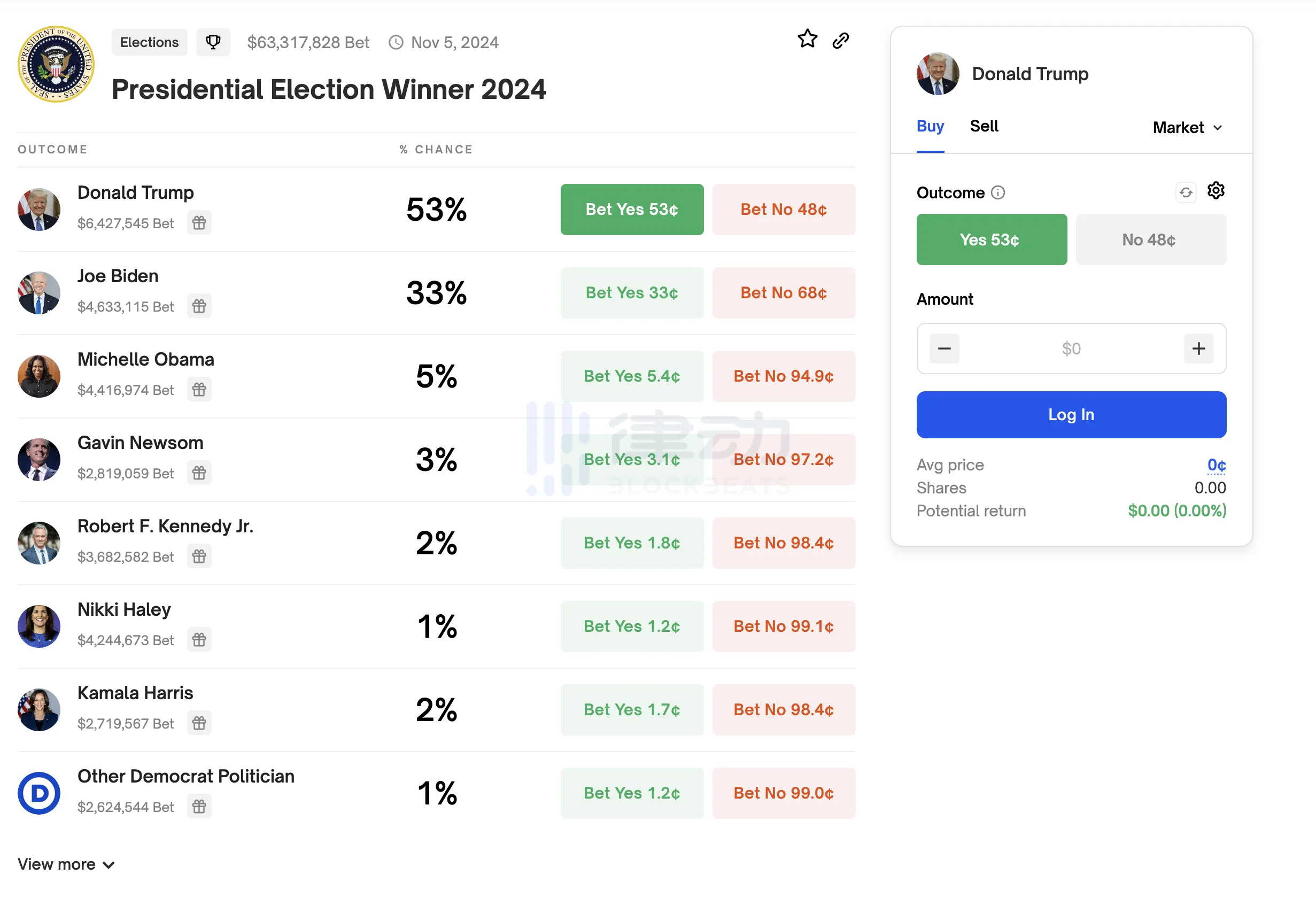 Polymarket「2024 年总统选举获胜者」预测